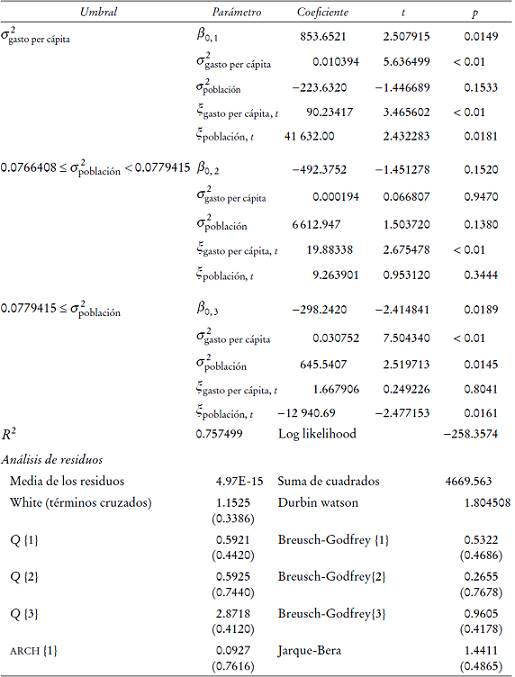 A continuación se analizan los efectos que sobre el crecimiento del PIB tienen las volatilidades condicionales y los componentes no esperados de los saltos de las tasas de crecimiento del gasto per cápita y de la población. Para tal efecto se estimará una regresión de umbral que permite analizar las relaciones de interés en diferentes regímenes.