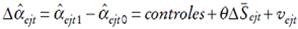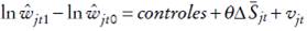 (9)Los controles introducidos son una constante, cambio en el logaritmo del empleo agregado, en la experiencia potencial promedio y variables correspondientes a las zonas geográficas. Por tanto, θ capta las externalidades del capital humano, y vejt , la variación en el intercepto no explicado por las variables incluidas en el lado derecho de la ecuación.