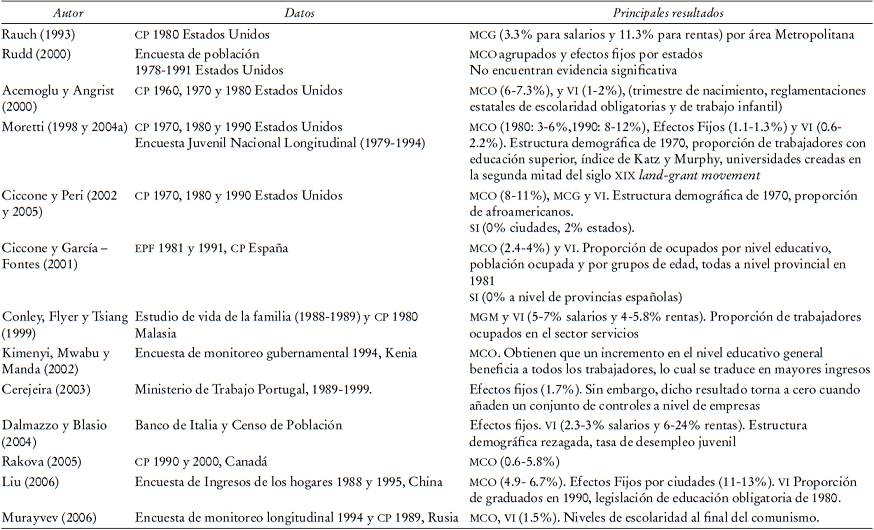 Los trabajos de Ciccone y Peri (2006), al proponer su enfoque de la composición constante de la fuerza de trabajo, dan un paso más allá porque distinguen entre el efecto de complementariedad y externalidades. Utilizan datos de ciudades y estados entre 1970 y 1990 en los Estados Unidos y, como variables instrumentales, la estructura demográfica de 1970 y la proporción de afroamericanos. En la primera parte de su trabajo donde suponen sustitución perfecta, obtienen que un incremento de un año de la escolaridad promedio genera un incremento de 8% en los salarios agregados de las ciudades. Mientras que cuando emplean su enfoque propuesto no obtienen evidencia significativa de externalidades positivas ni a nivel de ciudades ni de estados, poniendo en duda los resultados obtenidos en estudios previos (véase Cuadro 1).