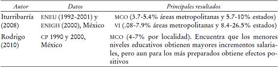 Con respecto al caso mexicano, sólo se han realizado los trabajos de Iturribarría (2008) y Rodrigo (2010). En ambos se sigue en primer lugar la especificación minceriana ampliada, y posteriormente se retoman los enfoques propuestos por Ciccone y Peri (2006) y Moretti (1998).