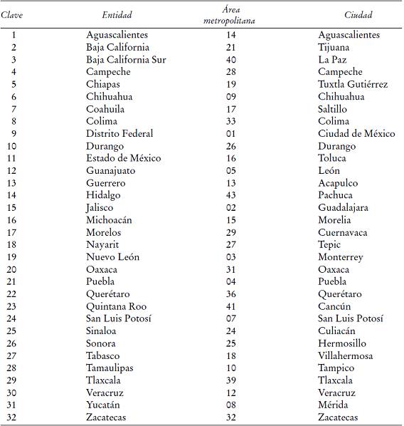 Además, los datos a nivel estatal se obtuvieron de los Censos de Población y Vivienda de los años 1990, 2000 y 2010. Se seleccionó el tercer trimestre de cada año respectivamente, ya que es el más utilizado en este tipo de trabajos por ser el de mayor estabilidad económica. La muestra se restringió a la población ocupada de 12 a 65 años de edad que percibió ingresos a sueldo fijo y laboró entre 20 y 60 horas en la semana de referencia. Con el objetivo de homogeneizar ambas encuestas, se han seleccionado únicamente las 32 áreas metropolitan=as que se mantienen en todo el periodo analizado, y por tanto se ha trabajado con información representativa para los 31 estados y el Distrito Federal (véase el Cuadro 3). Para enfrentar el problema de variables no observables se toma la clasificación de Chiquiar (2004) de los estados mexicanos en cinco regiones de acuerdo a su nivel de desarrollo, características geográficas, actividad económica y productividad: frontera, norte, centro, capital y sur.1