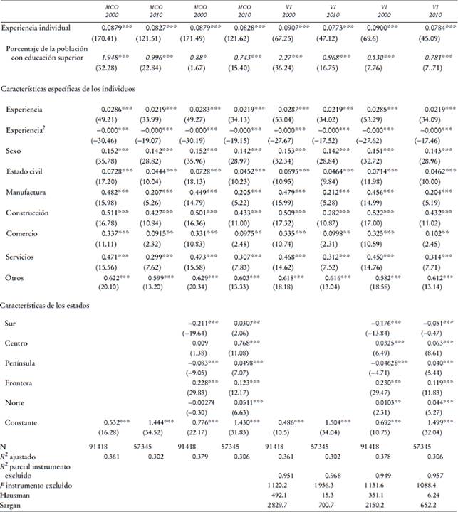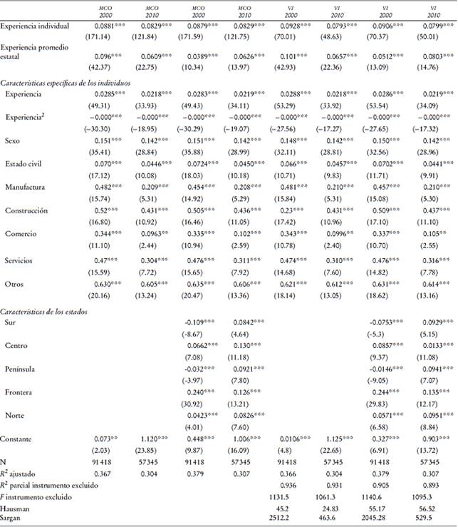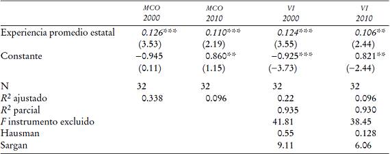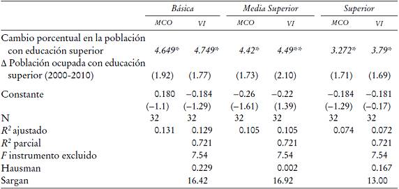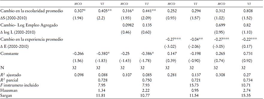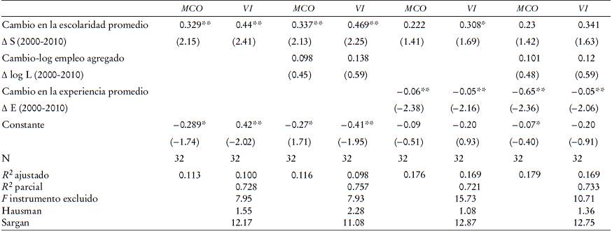 En segundo lugar, como instrumentos de la educación promedio agregada, utilizamos: i) la proporción de egresados de educación media superior y ii) la proporción de egresados de educación superior. Para las estimaciones del año 2000 utilizamos los datos de 1990, y para las del 2010, las proporciones del 2000, respectivamente. Esto significa que el nivel de escolaridad de generaciones previas tiene una alta influencia en el de las presentes, sin llegar a ser un determinante directo de su salario. Asimismo, también empleamos la estructura de la población de los estados en un periodo anterior de 10 años; en concreto, la proporción de la población joven (menor de 19 años) y la proporción de la población mayor de 49 años, la cual determinaría de cierta manera el nivel de estudios en el presente, sin estar correlacionados directamente con los cambios en los salarios. Esto implicaría, suponiendo que existen condiciones de igualdad de acceso a la educación, que los estados que tengan mayor porcentaje de población joven al inicio del periodo podrán tener por razones demográficas mayor probabilidad de incrementar sus niveles de escolaridad promedio en los siguientes años. De manera similar, los estados que tuvieran una mayor proporción de población envejecida al inicio del periodo podrían tener también una mayor tasa de sustitución entre esta cohorte de la población con menor nivel de cualificación que sería expulsado por otra, la de la población joven que tendría un mayor nivel educativo. De esta manera, la estructura de la población en un periodo previo determinaría de cierta manera el nivel de estudios en el presente, sin estar correlacionados directamente con los cambios en los salarios (García-Fontes e Hidalgo, 2009). Lo anterior implicaría que el nivel de escolaridad y la estructura de la población de generaciones previas tienen una alta influencia y determinan de cierta manera el nivel de estudios en el presente, sin estar correlacionados directamente con los salarios.