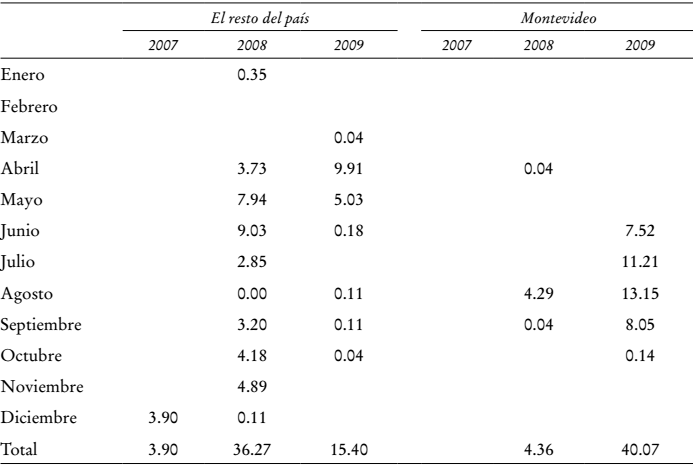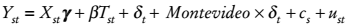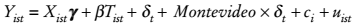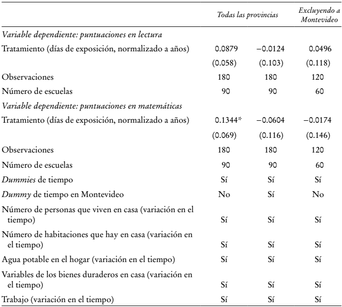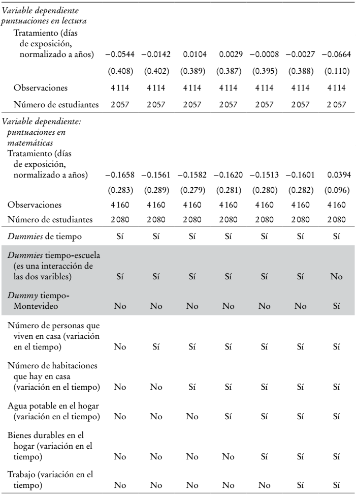 (3)Montevideo es una variable indicadora de las escuelas localizadas en la capital. Al incluir los términos de interacción entre Montevideo y el año 2009, la ecuación (3) nos permite controlar por la heterogeneidad inobservable variante en el tiempo entre regiones, respecto al momento base. Al igual que los anteriores, este modelo se calcula con efectos fijos individuales. Los errores estándar robustos están anidados a nivel de escuela.