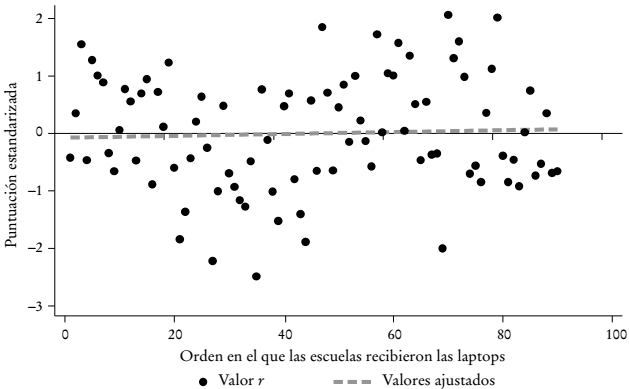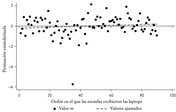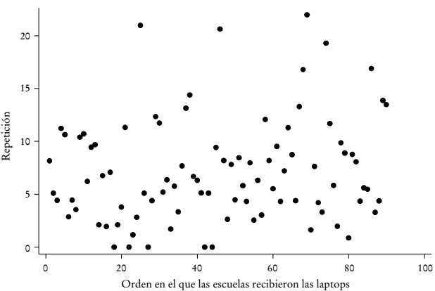 El Cuadro 1 muestra la distribución de observaciones por ubicación geográfica y año y mes de recepción de la laptop. Con la finalidad de evaluar si la entrega de las laptops fue exógena, graficamos el desempeño promedio en lectura y matemáticas en 2006 (previo a la implementación del Plan CEIBAL) con la fecha en que la mayoría de los niños de cada escuela recibió su laptop. Las Gráficas 1 y 2 muestran el desempeño promedio en lectura y matemáticas, respectivamente: El eje de las abscisas representa las escuelas ordenadas según la fecha en la que sus estudiantes recibieron la laptop de CEIBAL. Asimismo, la Gráfica A1 presenta las tasas de repetición de las escuelas, según la fecha en que la mayoría de sus alumnos recibió la laptop. El análisis gráfico sugiere que el criterio para el despliegue del programa no está correlacionado con los resultados educativos previos.