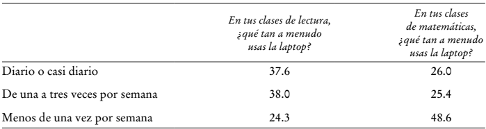 Los Los cuadros A3 y A4 intentan proporcionar algunas pistas acerca de las razones por las que el Plan CEIBAL no parece haber causado un impacto en lectura o en matemáticas. En primer término, la utilización de las laptops en el aula no está diseminada a lo largo de todas las escuelas públicas (véase el cuadro A3) . En segundo, según lo sugiere el cuadro A4, lo cierto es que la mayor parte del tiempo los estudiantes emplean su ordenador para buscar información en internet (68% de ellos respondió que en el salón de clases lo más frecuente es usar la laptop para hacer tales pesquisas) en vez de resolver ejercicios o llevar a cabo prácticas de repetición.12 El hecho de que las laptops sean usadas en clase principalmente para bajar información del internet sugiere que no deberíamos esperar impactos en lectura y matemáticas.