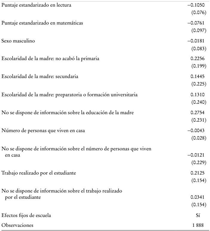 (4)el cual se ajusta con efectos fijos a nivel de escuela. Se presentan errores estándar anidados a nivel de escuela.