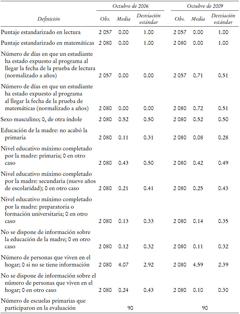 Utilizamos un panel de estudiantes evaluados en 2006 y 2009. En ambas olas se incluyeron pruebas estandarizadas de matemáticas y lectura junto con cuestionarios dirigidos a los estudiantes y sus familias, así como a los maestros y directores de los centros escolares. La primera ola corresponde a la evaluación del Segundo Estudio Regional Comparativo y Explicativo (SERCE) diseñada por la UNESCO e implementada en octubre de 2006. Para entonces los alumnos analizados en este trabajo cursaban tercer año.11