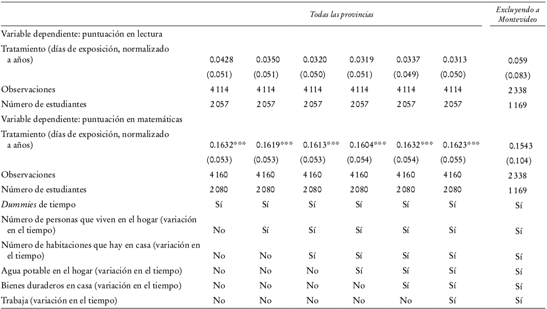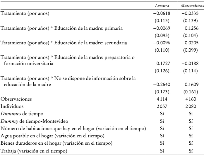 Finalmente, indagamos si se dan efectos heterogéneos entre los niños cuyas madres tienen diferente nivel educativo, según la principal especificación del Cuadro 6 (incluyendo una dummy tiempo-Montevideo), y encontramos que no se observan efectos significativos en lectura ni en matemáticas (véase el Cuadro 8).