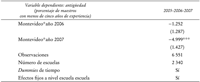 A fin de evaluar si preexisten diferencias entre las regiones, empleamos datos suministrados por las autoridades educativas (la ANEP) sobre la antigüedad de los maestros (el porcentaje de maestros con menos de cinco años de antigüedad) en todas las escuelas públicas de Uruguay. Para estimar el efecto de las tendencias diferenciales por región sobre la antigüedad de los docentes a nivel de escuela incluimos dos variables dummy: Montevideo X (interactuado) 2006 y Montevideo en 2007, al igual que dummies de tiempo y efectos fijos a nivel de escuela. Se reportan errores estándar robustos anidados a nivel de escuela. Se observa una evolución diferencial de la antigüedad docente en Montevideo y en el resto del país durante 2007, la cual fue significativa a 1% (véase el Cuadro 5). Esto sugiere que no deberíamos estimar la ecuación (1) sin controlar por las trayectorias divergentes que sigan las distintas regiones. De lo contrario, el tratamiento se confundiría con las diferencias preexistentes en las trayectorias de aprendizaje.