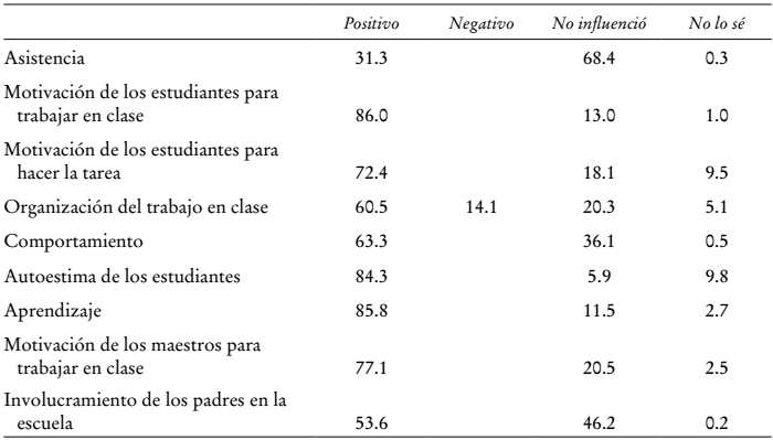 El conjunto de datos que examinamos incluye una encuesta que fue aplicada a estudiantes, familiares de éstos, maestros y directivos de los centros escolares respecto al Plan CEIBAL y que se llevó a cabo en octubre de 2009. Según los resultados obtenidos, para ese año 87% de los directivos de escuelas tenía acceso a internet, pero, debido a problemas de la conectividad, no todos los alumnos de diversos grados se podían enlazar a la red simultáneamente. De hecho, a decir de 83% de los directivos escolares, menos de la mitad de los alumnos se podía conectar a la vez. Hay que añadir que el juicio de estas autoridades sobre las repercusiones de CEIBAL era extremadamente positivo en todos los aspectos, en particular en lo referente a la motivación que mostraban los estudiantes para trabajar en clase y aprender (véase el cuadro A1). En cuanto a los maestros, 59% de ellos respondió que usaban una computadora a diario. Por su parte, 65% de los estudiantes contestó que en su casa había una computadora de escritorio o portátil (sin contar la obsequiada por el Plan CEIBAL), mientras que 47% podía acceder a internet ya sea por medio de la banda ancha o del módem inalámbrico de la escuela. Casi todos los padres observaron que los estudiantes empleaban la laptop de CEIBAL en casa, mientras que 80% de ellos señaló que también usaban otro ordenador (véase el cuadro A2).