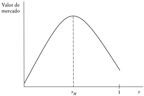 Supuesto 1: el valor de mercado, y(r,s) :[0,1] ×[0, ∞)→ ℜ+, es una función estrictamente cóncava en r, creciente en s, con función derivada ∂y(r, s)/∂r no decreciente y estrictamente cóncava en s. Además, lims→0∂y/∂s = ∞ y lims→ ∞∂y/∂s = 0. Finalmente, rM(s) ≡ argmax y(r,s) es menor que uno, con lims→∞rM(s)≤ 1.