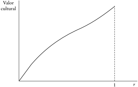 Este supuesto restringe nuestro análisis a aquellos casos en los que podemos aplicar herramientas de cálculo diferencial y además especifica la forma general que cada una de las dos subfunciones de utilidad tendrá con respecto al nivel de creatividad. La Gráfica 2 muestra el valor cultural como función del nivel de creatividad. Aquí, la curva alcanza un máximo en la solución de esquina, r = 1. Es decir, el valor cultural de una obra de arte alcanza su máximo cuando el artista aplica el máximo nivel de creatividad a ésta. Aunque el supuesto 2 no impone condiciones especiales sobre el grado de concavidad o convexidad, es decir, sobre la curvatura de la subfunción de utilidad del valor cultural, es importante recordar que para obtener una solución interior en el problema global de optimización para el artista, será necesaria cierta condición sobre la segunda derivada de la función de valor de mercado.