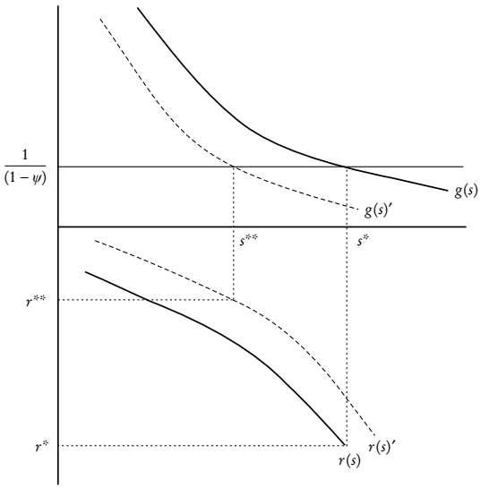 (6)En virtud de los supuestos, el término entre corchetes es una función decreciente en s, y su límite es infinito cuando s se acerca a 0, y viceversa. Se trata de la derivada total del ingreso con respecto a s, y si lo denotamos por g(s), en equilibrio deberá cumplirse que: