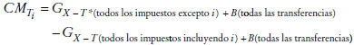 En esta sección se presentan las condiciones que formalmente vinculan la caída de la desigualdad (medida con el coeficiente de Gini) y las características de los componentes del sistema fiscal.8 Las características del sistema fiscal que determinan el grado de redistribución son esencialmente dos: el tamaño de todos los componentes de la política fiscal, medido como la razón entre el monto total de la intervención fiscal y el ingreso total antes de la política fiscal, y la progresividad de todos los componentes.