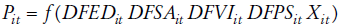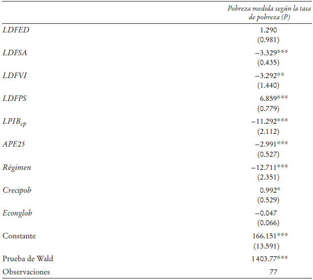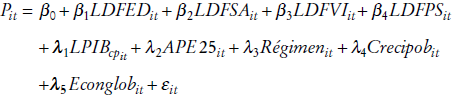 Nuestro modelo empírico se basa en el supuesto de que la DF de las principales políticas de gasto en educación (DFED), salud (DFSA), vivienda (DFVI) y otras acciones de protección social (DFPS) inciden en la pobreza (a la que se hace referencia en nuestro modelo mediante P, ya que utilizamos la tasa de pobreza o proporción de pobres (headcount ratio) considerando como línea de pobreza absoluta los dos dólares al día -paridad del poder adquisitivo (PPA)-.2 Hemos incluido estas variables en nuestro modelo con el objetivo de controlar eficientemente el efecto que tiene la descentralización del gasto público en las áreas enlistadas. El modelo empleado para explicar el nivel de pobreza (Pit ) en un país determinado se puede expresar como: