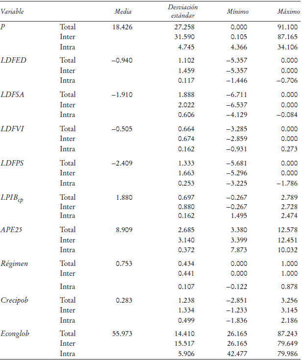 La pobreza, que es nuestra variable dependiente, se mide a través de la tasa de pobreza (P) considerando la línea de pobreza absoluta de dos dólares al día -paridad de poder adquisitivo (PPA). Como es bien sabido, esta tasa de pobreza es el porcentaje de la población que vive con menos de dos dólares al día, considerando los precios internacionales de 2005 (la información procede de la Base de Datos sobre Desigualdad y Pobreza del Banco Mundial).
