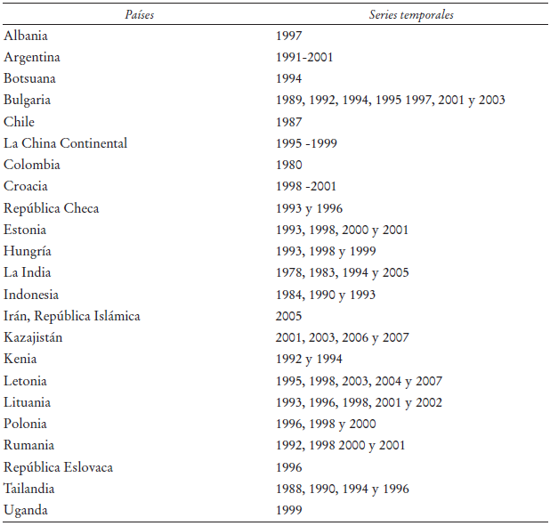 En lo que se refiere a las variables relativas a las características de los países, se ha seleccionado el logaritmo del producto interior bruto per cápita (LPIBcp ) -expresado a precios constantes según la paridad del poder adquisitivo del dólar estimado a nivel internacional y con base en el año de 2005- como variable de renta. Los datos para esta variable provienen de los Indicadores de Desarrollo Mundial (IDM) del Banco de Datos del Banco Mundial. Se ha tenido en cuenta el régimen político (Régimen) al introducir una variable ficticia que adopta el valor de uno cuando el país posee un sistema democrático y el valor de cero si tiene un sistema dictatorial. Esta información procede de los Datos Pippa Norris de la Escuela de Gobierno John F. Kennedy de Harvard University. El crecimiento de la población recoge las características demográficas. Para esta variable hemos obtenido los datos de los IDM ya mencionados. Los años promedio de educación obtenida por la población de más de 25 años de edad constituye una medida del capital humano de un país. El Banco Mundial ofrece datos acerca del indicador Barro-Lee cada cinco años. Con el propósito de completar nuestro panel de datos, optamos por usar los suministrados por Gakidou et al. (2010), donde se encuentran datos anuales de 1970 a 2009. Finalmente, elegimos el índice KOF de globalización económica como una variable proxy de integración en la economía mundial. Este indicador toma en cuenta tanto los flujos económicos reales como las variables proxies para las restricciones al comercio y al capital, y ha sido ampliamente usado en la literatura económica.