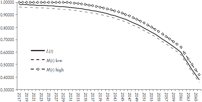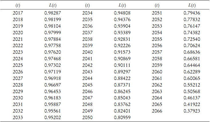 Se comienza con el índice de longevidad proporcional base L(t), que indica la longevidad esperada ex ante (parte fija del swap). Por simplicidad y sin pérdida de generalidad, en la simulación solamente se modela el fenómeno de mortalidad en el género masculino, para lo cual se utilizan las tablas de mortalidad EMSSAH-97 publicadas por la Comisión Nacional de Seguros y Fianzas (CNSF), con las que se puede construir directamente la variable li (t).15