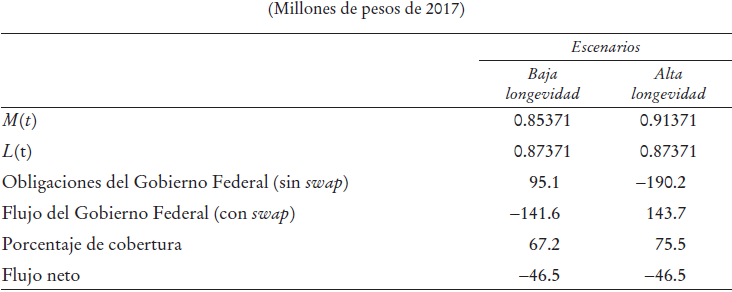 De este ejercicio de simulación podemos concluir que la contratación de un swap de longevidad provee una cobertura del riesgo de longevidad notable, ya que cuando se considera un escenario de longevidad desfavorable, los flujos del swap cubren un porcentaje relativamente alto de los compromisos adicionales. Sin embargo, por esta cobertura se tiene que pagar un costo, el cual tiene un recargo en contra del gobierno federal por construcción.