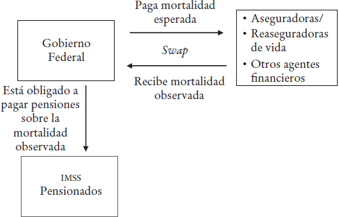 En el pasado, el gobierno federal mexicano ha transferido el riesgo de longevidad y otros riesgos relacionados con los sistemas de pensiones por medio de las reformas a los dos grandes sistemas, el IMSS en 1997 y el Instituto de Seguridad y Servicios Sociales de los Trabajadores del Estado (ISSSTE) en 2007. Al incorporar a los asegurados y futuros pensionados en el esquema dual de ahorro para el retiro en cuentas individuales, durante la etapa de acumulación, y los retiros programados o la compra de rentas vitalicias, en la etapa de desacumulación, el riesgo de longevidad se transfirió del gobierno federal hacia los trabajadores y hacia las compañías privadas que otorgan las rentas vitalicias.