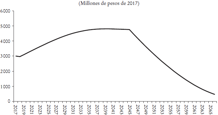 En el modelo utilizado se cierra la entrada a nuevos pensionados en el año 2044 y, a pesar de que el monto de pensión individual sigue creciendo, al cerrarse el grupo, la mortalidad asociada va disminuyendo la obligación financiera total del fondo de pensiones simulado.