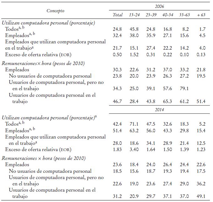 En esta sección se contextualiza la dinámica y el estado de la situación acerca del uso de la computadora por los individuos en el país. Para ello se combinan dos encuestas realizadas por el Instituto Nacional de Estadística y Geografía (INEGI); una es la ENOE y la otra es la Encuesta Nacional sobre Disponibilidad y Uso de Tecnologías de la Información en los Hogares (ENDUTIH), ambas con representatividad nacional. Con el propósito de considerar los cambios en el tiempo, el análisis se basa en dos momentos separados por ocho años: segundo trimestre de 2006 -ENOE y ENDUTIH-1 y segundo trimestre de 2014 -ENOE y Módulo sobre Disponibilidad y Uso de Tecnologías de la Información en los Hogares (MODUTIH)-.
