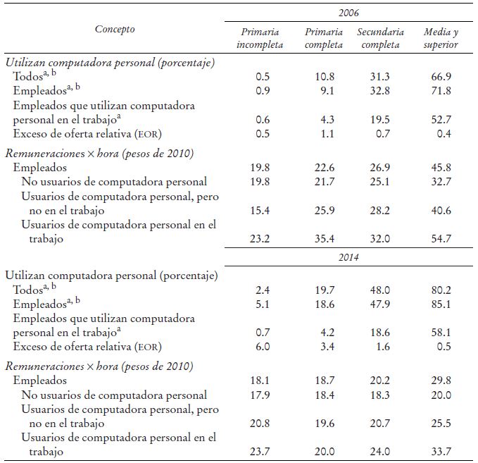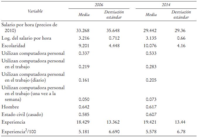 Como ya se mencionó, la información que se utiliza para el análisis empírico proviene de la combinación de la ENOE y la ENDUTIH para 2006 y de la ENOE y el MODUTIH para 2014. De la ENOE se utiliza información del segundo trimestre, mismo que el INEGI utiliza como marco muestral de la otra encuesta, la cual es única en cada año. Ambas tienen representatividad nacional: la primera proporciona información sobre características socio-demográficas y laborales de los individuos y permite ser asociada con la segunda, que brinda información sobre el uso de computadora.3 Para el contraste empírico interesa la información sobre los individuos que trabajan como asalariados de tiempo completo.