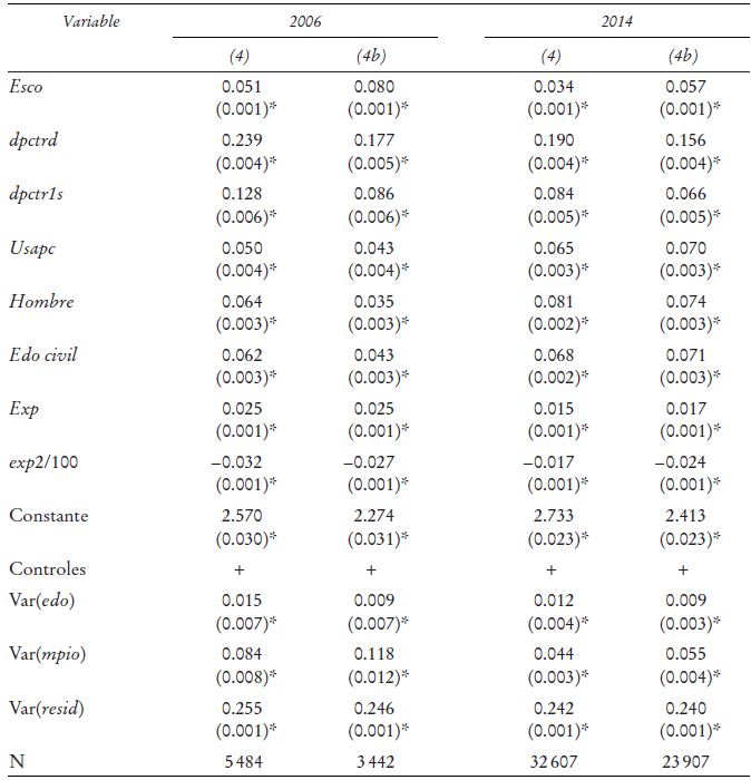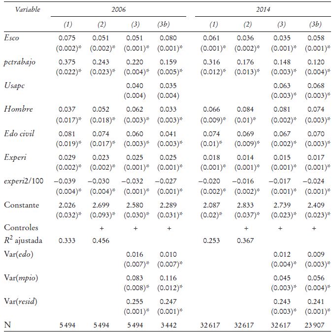 La ecuación (1) se estimó por mínimos cuadrados ordinarios (MCO) excluyendo gran parte de los controles representativos de otras habilidades y de las diversas heterogeneidades que influyen en la determinación de los salarios. La ecuación (2) también se estimó por MCO, pero incluye 26 variables de control que captan el efecto de heterogeneidades fijas. Estas dos especificaciones tienen en común que ninguna toma en cuenta el sesgo de selección, esto en el sentido de que quienes utilizan computadora en el trabajo son también los más habilidosos, por lo que las mayores remuneraciones recibidas se deben a esas otras habilidades. De la ecuación (3) se estimó también la versión (3b), la cual se aplica únicamente a trabajadores con secundaria terminada o más. Ambas ecuaciones se estimaron como modelos de efectos mixtos por el método de máxima verosimilitud, que considera efectos fijos heterogéneos y efectos aleatorios de heterogeneidades regionales no observables (en los niveles estatal y municipal); además, controlan el sesgo de selección al incluir la variable usapc como representativa de otras habilidades valoradas en el mercado laboral.10