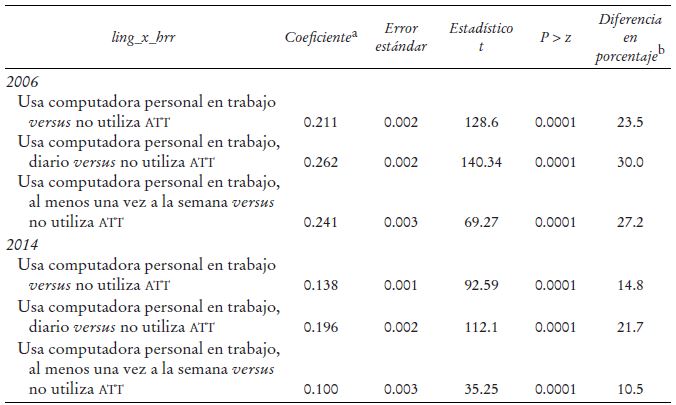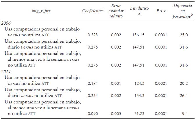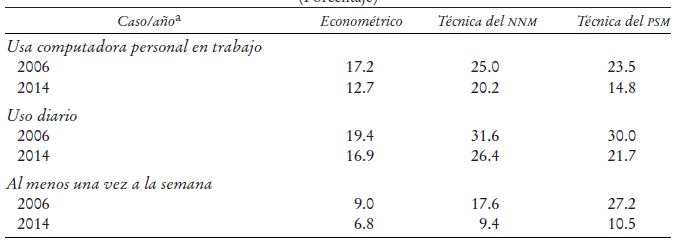 Con cualquier método se valida que existen diferencias salariales por la utilización de computadora en el trabajo: sin distinguir intensidad de uso, en 2006 las diferencias porcentuales se ubicaban en el rango de 17.2 y 25%; para 2014 el rango se estableció entre 12.7 y 20.2%. En general las estimaciones econométricas arrojaron las diferencias más bajas; las más amplias se registraron con la técnica NNM.