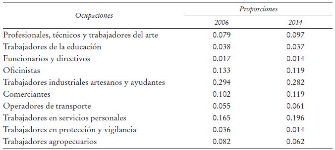 Ocup. Vector con 11 variables binarias que indican las siguientes ocupaciones: i) Profesionales, técnicos y trabajadores del arte; ii) Trabajadores de la educación; iii) Funcionarios y directivos; iv) Oficinistas; v) Trabajadores industriales, artesanos y ayudantes; vi) Comerciantes; vii) Operadores de transporte; viii) Trabajadores en servicios personales; ix) Trabajadores en protección y vigilancia; x) Trabajadores agropecuarios y, xi) No especificado. En las estimaciones, se excluye la primera como categoría base.