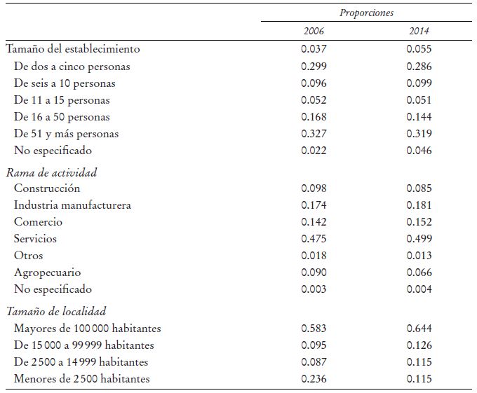 Tam. Vector con seis variables binarias que indican el tamaño del establecimiento: i) Más de 50 personas; ii) 16 a 50 personas; iii) 11 a 15; iv) seis a 10; v) dos a cinco; vi) una persona y vii) No especificado. La categoría base es el establecimiento más grande.