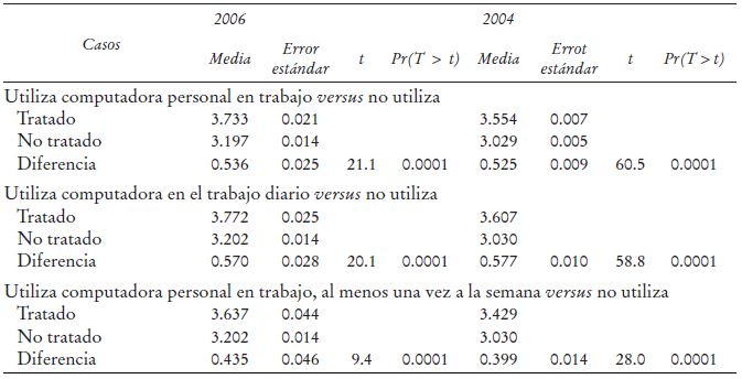 Finalmente, se calcula la media de las diferencias entre tratados y no tratados; si ésta es significativamente mayor a 0, la conclusión es que los individuos que utilizan computadora en el trabajo en promedio ganan ATT más que quienes no lo hacen.