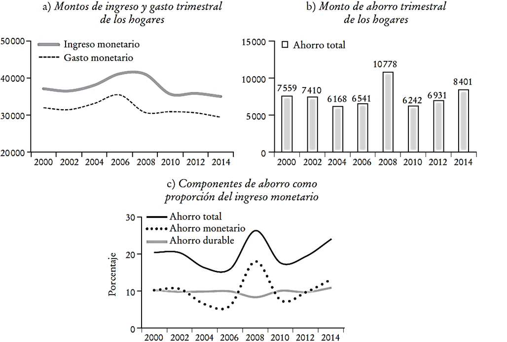 La Gráfica 1 presenta los flujos trimestrales de ingreso, gasto y ahorro de los hogares. El ahorro total en el periodo 2000-2014 representó entre 16 y 26% del ingreso monetario de las familias. Aunque es difícil definir una tendencia general en el periodo, se identifica que la proporción de ahorro cayó cerca de cinco puntos porcentuales entre los años 2000 y 2006; en 2008 la proporción de ahorro alcanzó su máximo, con 26.2%; pero en 2010 el ahorro se acercó nuevamente a los niveles más bajos del periodo, probablemente como reflejo de los efectos de la crisis financiera; finalmente, los dos últimos cortes de la encuesta muestran una recuperación que acercó la proporción de ahorro a 24% del ingreso en 2014.