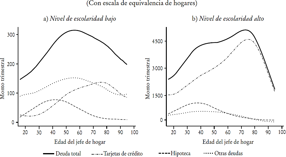 En referencia a las tarjetas de crédito, no es novedad que sean los hogares con mayores niveles de ingreso y los más educados los que en mayor proporción hacen uso de las tarjetas; sin embargo, el análisis previo muestra que las tarjetas de crédito son un importante instrumento de financiamiento hacia la segunda parte del ciclo de vida, lo que es un comportamiento diferente entre el resto de patrones de deuda que sólo participan de manera importante en la primera parte de la vida familiar.