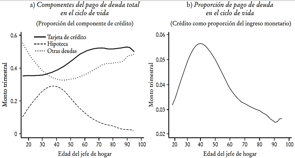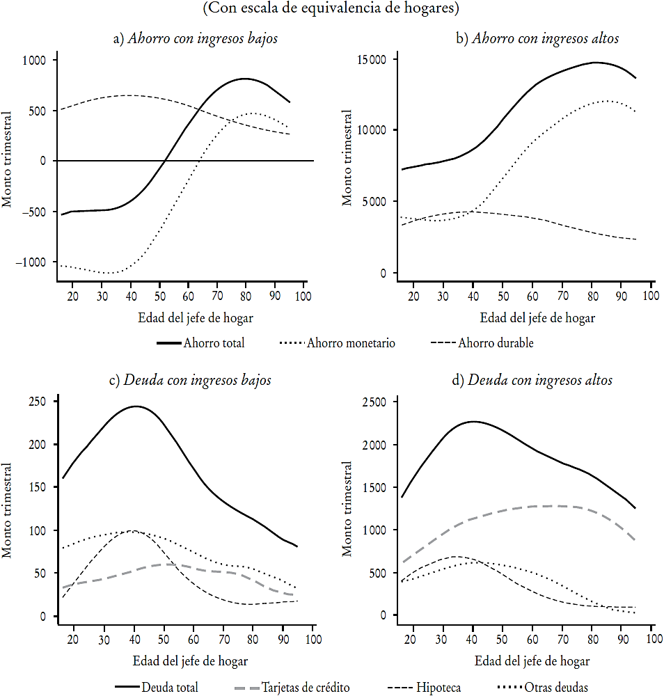 Se destaca el uso diferenciado de ahorro y crédito para el financiamiento del consumo de las familias a lo largo del ciclo de vida. Al inicio, los hogares usan la deuda y su conducta es determinada principalmente por el pago de vivienda y de bienes durables; en los hogares con mayor escolaridad y mayor nivel de ingresos el pago de tarjetas de crédito cobra relevancia. Hacia la segunda parte del ciclo de vida -una vez que se alcanzó el flujo máximo de ingresos- las familias se apoyan más en el ahorro guiado por el componen-te monetario. Dado que el máximo de ahorro monetario se alcanza en una fase avanzada del ciclo de vida, la reducción de los tamaños de hogar en esta fase y la caída del consumo derivan en un comportamiento suavizado del ahorro total que contrasta con las predicciones del MCV. Al parecer, los hogares ahorran al final de la vida familiar con motivos precautorios, pero quizás también por razones altruistas y para dejar un legado.