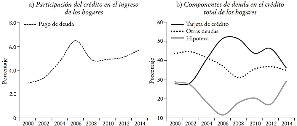 En cuanto al pago de deuda, la Gráfica 2a muestra que el crédito tiene generalmente un comportamiento creciente; en 2006 el pago de crédito de los hogares alcanzó el máximo del periodo con 6.48% del ingreso, mientras que en 2008 -cuando el ahorro alcanzó su máximo- se presentó una caída hasta de 4.88% del ingreso; después de 2008 el comportamiento del pago de deuda como proporción del ingreso se mantuvo creciente por encima de 4.9% en 2010 y hasta 5.7% en 2014. La Gráfica 2b muestra la composición del pago de deuda por rubro a lo largo del periodo. Lo más notable es el comportamiento creciente de la participación del pago de tarjetas de crédito, mientras el peso de otras deudas y de la deuda hipotecaria disminuyen entre 2000 y 2008, con una leve recuperación hacia el final del periodo.