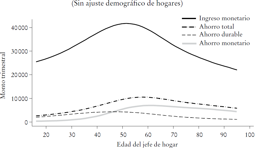 El ingreso de los hogares se incrementa casi 70% entre los 18 años y el máximo alcanzado, alrededor de los 52 años del jefe de hogar. Es de resaltar que el máximo flujo de ahorro se alcanza unos seis años después del máximo de ingreso familiar; el flujo de ahorro pasa de menos de 3 000 pesos trimestrales -cuando el jefe de hogar tiene 18 años- a más de 10 000 cuando se acerca a los 58 años.