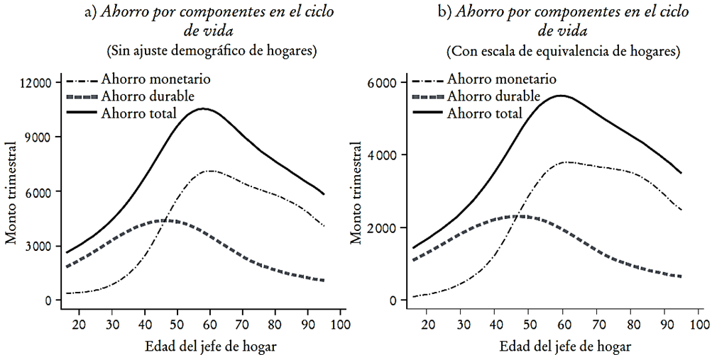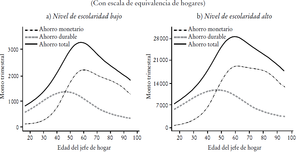 Conducidos por el ahorro monetario, hogares con menor escolaridad inician primero el ciclo de ahorro total. Los hogares con menor escolaridad inician un ciclo de ahorro monetario creciente a los 33 años, mientras que los hogares con más escolaridad tardan alrededor de seis años más del jefe antes de iniciar la fase más empinada del ciclo. En cuanto a los bienes durables, los hogares con jefes más educados alcanzan el máximo alrededor de los 45 años, mientras los hogares con menos escolaridad lo alcanzan cinco años después. Adicionalmente, el máximo flujo de ahorro durable en hogares con jefes más educados se mantiene durante 20 años; el doble de la duración en los hogares encabezados por personas con menor escolaridad.