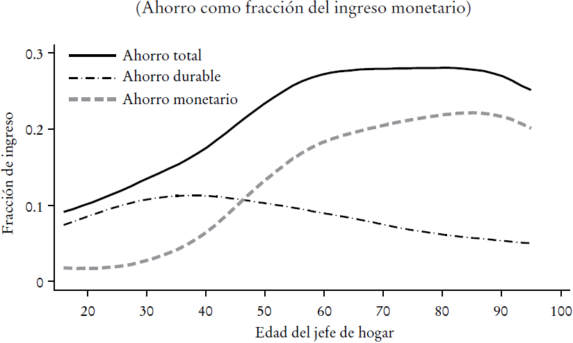 Otro aspecto que hay que destacar de esta revisión es el comportamiento suavizado del perfil de ahorro hacia el final del ciclo de vida: existe una muy leve caída del flujo máximo de ahorro monetario entre los 60 y 80 años del jefe de hogar. El MCV predice teóricamente que, dado el comportamiento suavizado que se espera del consumo, el ahorro cae con el ingreso en la segunda parte del ciclo de vida. Este trabajo evidencia que tal caída en el ahorro no aparece sino hasta el cierre del ciclo de vida, a pesar de la merma del ingreso familiar; este hallazgo empírico puede estar explicado no sólo en la no suavización del consumo evidenciada por Campos y Meléndez (2013), sino en una mayor caída del perfil de consumo frente al descenso de los ingresos al final del ciclo de vida en México.