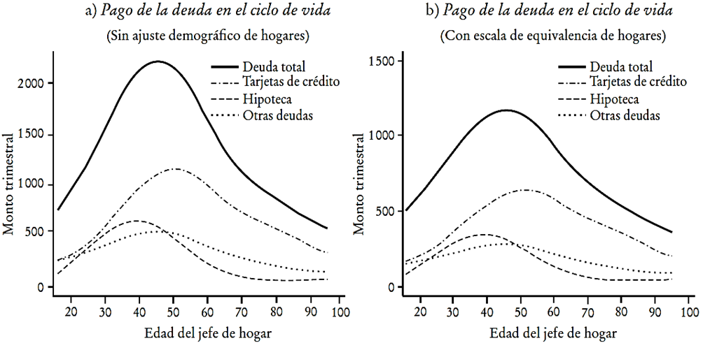 La conducta del crédito de las familias en ciclo de vida y de sus tres componentes tienen forma de U invertida y alcanzan los máximos mucho antes que los patrones de ahorro. Los perfiles de deuda son muy similares antes y después de ajustar por la escala de equivalencia. La Gráfica 6 muestra que el flujo máximo de pago de deuda ocurre a los 45 años del jefe; es decir, alrededor de cinco años antes de que el hogar alcance el máximo de ingresos y casi 15 años antes del máximo flujo de ahorro. Entre los componentes del crédito total, el pago de vivienda alcanza el máximo a los 40 años del jefe, mientras que el pago de otras deudas lo alcanza cinco años después. El pago de tarjetas de crédito alcanza su máximo junto con el mayor flujo de ingresos.