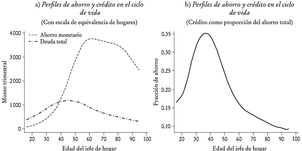 Al principio de la vida familiar, el crédito es determinado principalmente por el pago de vivienda y otros bienes durables, pero se observan grandes diferencias entre los hogares con menores niveles de educación e ingresos y los más ricos. En esta fase del ciclo el ahorro es bajo -incluso negativo en algunos tramos-, pero una vez que se logra el flujo máximo de ingresos, el componente monetario conduce al máximo de ahorro total y adopta un comportamiento suavizado entre los 60 y 80 años de edad del jefe de familia. Los resultados son congruentes con la idea de que en México existen importantes restricciones de liquidez al inicio del ciclo de vida y de que los hogares ahorran con motivos precautorios hasta el final del ciclo familiar.