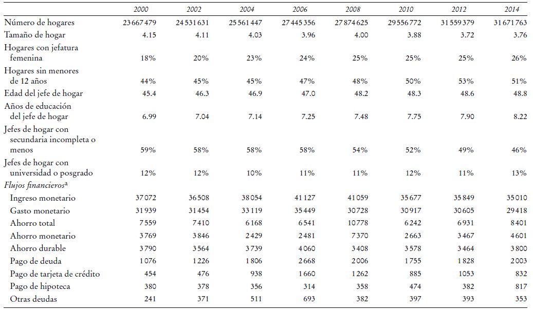 El resto de las características demográficas el Cuadro 1 muestra que el número de hogares se incrementó cerca de ocho millones, mientras que el tamaño promedio de hogar descendió de 4.15 en 2000 a 3.76 personas en 2014. Otras características de los cambios demográficos muestran el incremento de los hogares encabezados por mujeres, la disminución de los hogares con población menor de 12 años y el incremento de los años de escolaridad del jefe de hogar, entre otros.