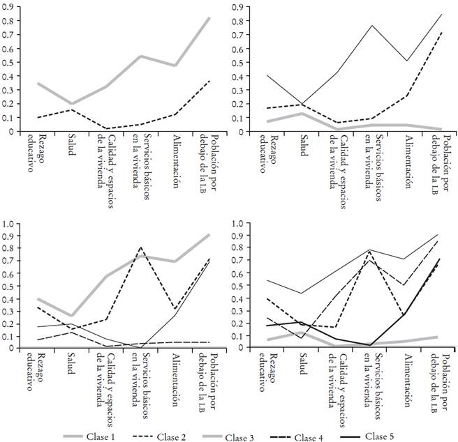 El cuarto elemento, el análisis de gráficas de probabilidades estimadas (Gráfica 1), muestra evidencia de que el número óptimo de clases es dos o tres, dado que, a partir de cuatro clases, las gráficas se cruzan, lo que implicaría una clasificación errónea.9 En ese sentido, a reserva de considerar algunos otros indicadores distintos a los de la medición de pobreza multidimensional oficial de México del Coneval, se puede concluir que el número de clases quedará en tres, debido a que es a partir de este número de clases que el BIC ajustado y la prueba de Lo-Mendel-Rubin muestran los mayores cambios, además de que el análisis gráfico presenta clases distinguibles.