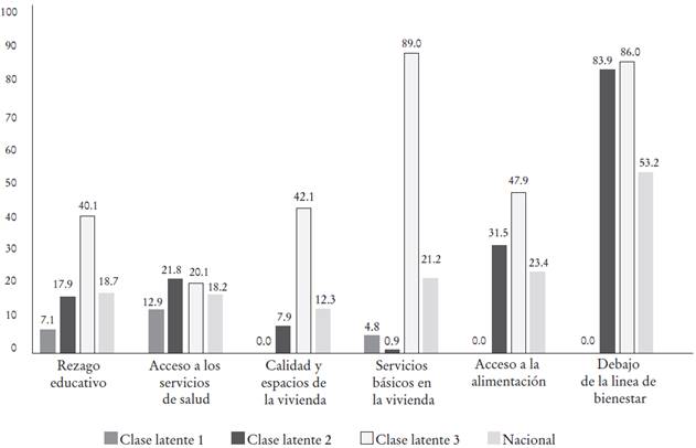 En el lado opuesto, la clase latente 3 muestra indicadores de pobreza por encima del promedio nacional. De la población de esa clase latente, 86% está debajo de la línea de bienestar, 89% no cuenta con servicios básicos de vivienda y casi 50% de ellos no cuenta con acceso a la alimentación. En el caso de la clase latente 2, se observan indicadores similares a los de la media nacional para rezago educativo, el acceso a los servicios de salud y la calidad y los espacios de la vivienda. Sin embargo, en servicios básicos en la vivienda, acceso a la alimentación y, en mayor medida, el ingreso, sus indicadores están por encima de la media nacional. De manera particular, en el ingreso, el porcentaje de población debajo de la línea de bienestar es muy similar al que presenta la clase 3.