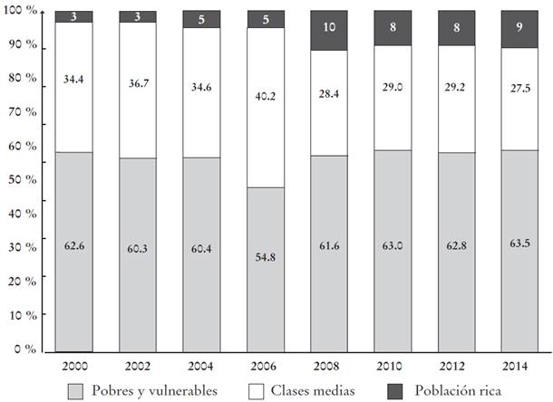 México, dada la persistencia de su pobreza y desigualdad en el tiempo, expresión también de la carencia de políticas públicas redistributivas efectivas, sigue siendo un país de pobres y no de clases medias. Es de tal magnitud el tamaño de la población pobre y vulnerable y su persistencia en el tiempo, que proporcionalmente a su población total es 2.3 veces el tamaño de las clases medias. Si nuestro punto de partida es el comienzo del nuevo milenio, en el año 2000 la población pobre y vulnerable sumaba 62.6%, mientras que para 2014 prácticamente se había mantenido inamovible. Es y sigue siendo la población mayoritaria del país. Más aún, sin realizar el ejercicio de estimación de clase media con la metodología consistente de la medición multidimensional de pobreza, la población pobre y vulnerable era de 79.6% en 2014, cifra similar a la reportada en otras mediciones de pobreza multidimensional como el MMIP y el MBS (Reyes y López, 2016).