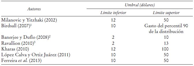 Estudios de referencia en la literatura, como los de Milanovic y Yitzhaki (2002), Banerjee y Duflo (2008), Kharas (2010), Ravallion (2010) y López-Calva y Ortiz-Juárez (2011), hasta el más reciente publicado por Ferreira et al. (2013), definen a la clase media de acuerdo con un umbral absoluto de ingreso, cuya heterogeneidad varía desde los dos hasta los 100 USD PPC (Cuadro 1). Birdsall (2010) emplea un método híbrido que combina umbral inferior absoluto (10 USD por día) con umbral superior relativo (percentil de ingreso 95).