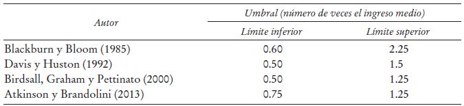 Aunque pobreza y clases medias implican de origen dos marcos conceptuales distintos, una parte de la literatura toma como referencia los umbrales de pobreza para determinar una cota inferior en los indicadores que se usan para definir y clasificar a la clase media, fundamentalmente para fines de consistencia en la medición entre pobres y clase media (Székely, 2005).8 Así, un hogar o individuo catalogado como pobre no es al mismo tiempo parte de la clase media.