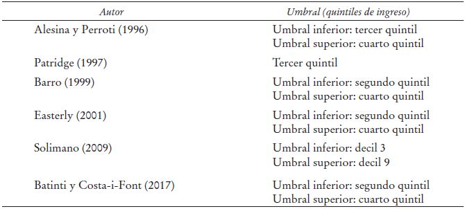 Además de las definiciones absolutas de la clase media basadas en los ingresos, existe otro tipo de estudios que la definen desde una perspectiva relativa, usando umbrales respecto de un punto de referencia o parámetro. El primero de ellos es el ingreso per cápita y los múltiplos de éste para establecer rangos, por debajo de los cuales la población sería pobre y, por encima de ellos, rica (Blackburn y Bloom, 1985; Davis y Huston, 1992; Birdsall et al., 2000; Atkinson y Brandolini, 2013). Como en toda la serie de trabajos de clase media basados en ingresos, no hay consenso sobre los umbrales inferiores y superiores en los que se encontraría esta clase media. Entre las limitaciones de este tipo de clasificaciones relativas que utilizan ingresos relativos se encuentra la dificultad de comparar clases medias entre países, derivadas de umbrales cuyo punto de referencia son las medias: ingresos medios diferentes de cada región o país (Cuadro 2).