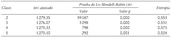 El Cuadro 4 muestra los resultados de medidas de ajuste de clases latentes; de acuerdo con los niveles BIC ajustados, prueba de Lo-Mendell-Rubin y niveles de entropía, no se puede ser concluyente. Se puede, en todo caso, identificar que las clases óptimas deben estar entre tres y cinco.