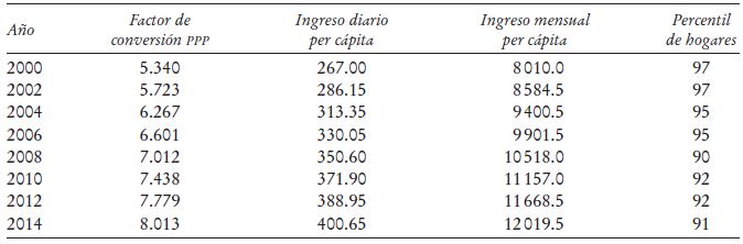 El ingreso máximo diario de 50 USD PPP es equivalente a 400 MXN. Tal ingreso lo adquiere en el periodo de estudio entre el percentil 97 y el percentil 91 en la distribución del ingreso, teniendo como periodo de quiebre los años de crisis alimentaria y económica-financiera de 2006 y 2008, respectivamente.